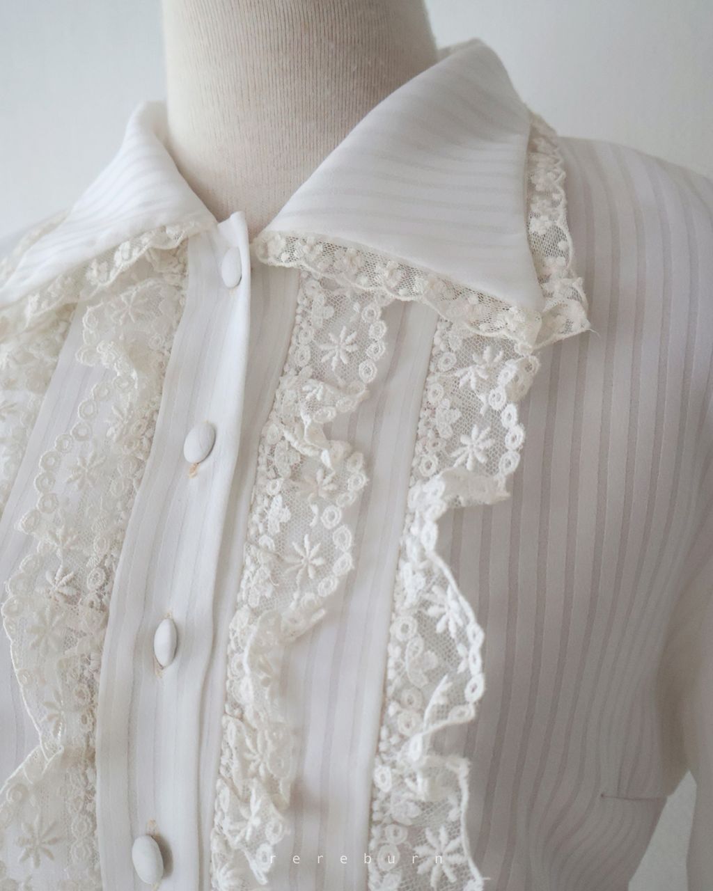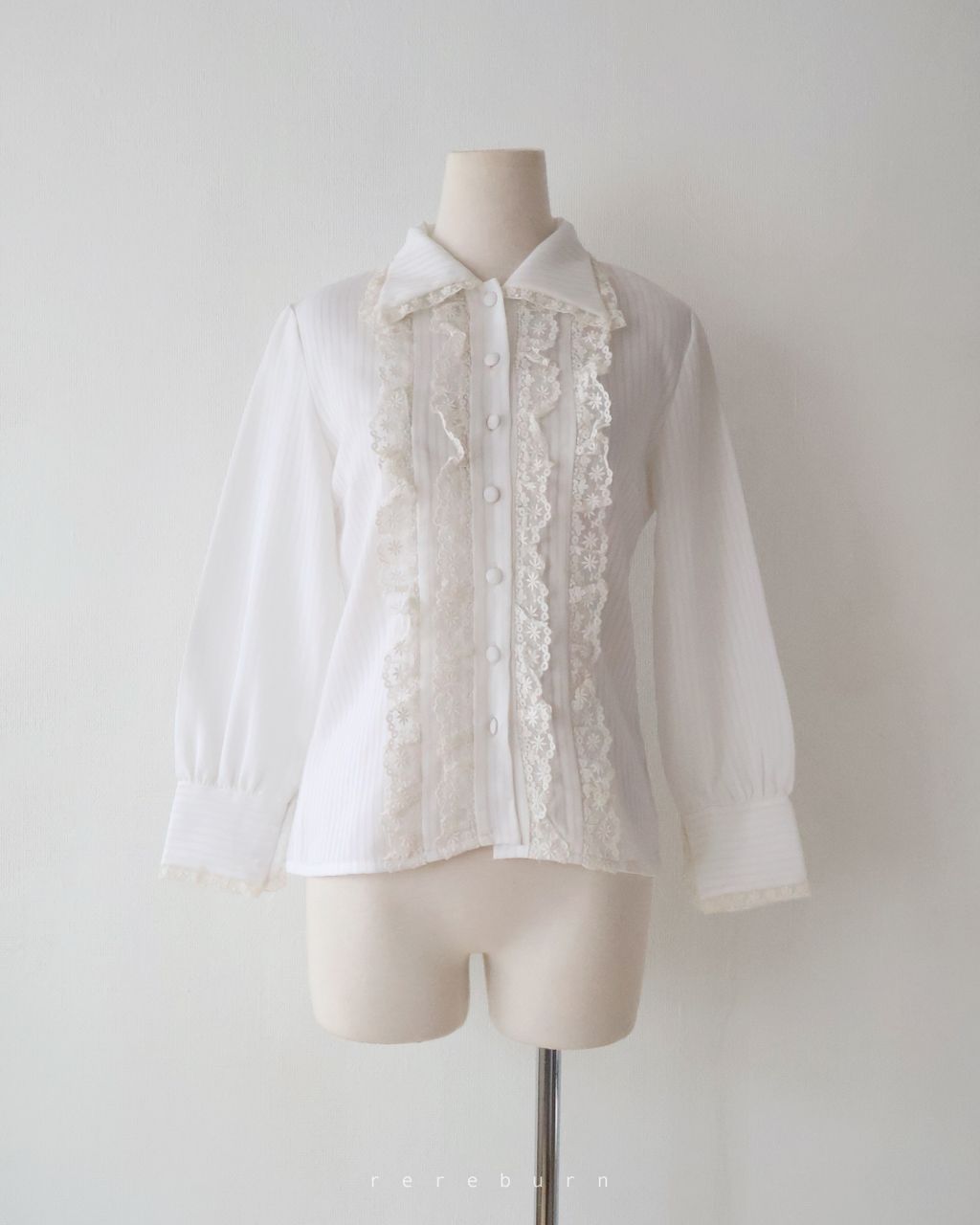 日系復古蕾絲拼接條紋領長袖白色古著襯衫-T931