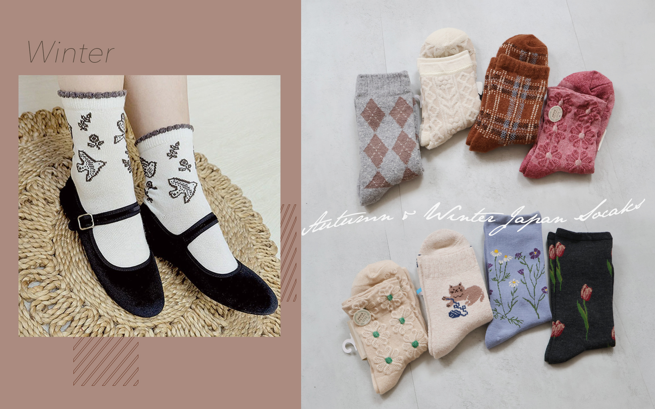 早春日本選品日系貓咪幾何花朵保暖襪子2色-米黑