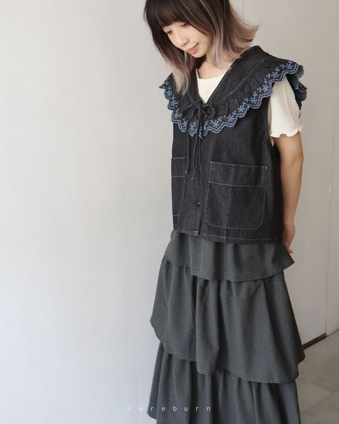 夏日系大人感花朵刺繡蕾絲寬鬆外搭背心2色-黑