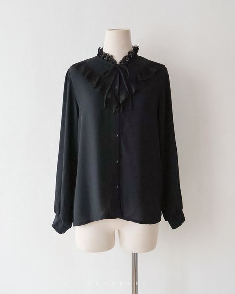 復古蕾絲刺繡領寬鬆歐美版型長袖白色古著襯衫-T166