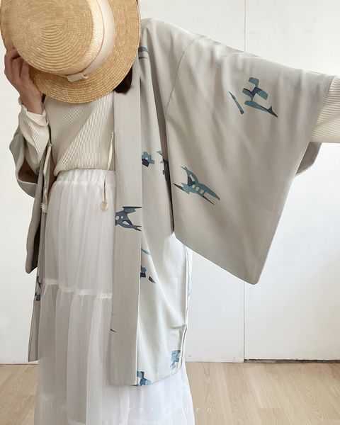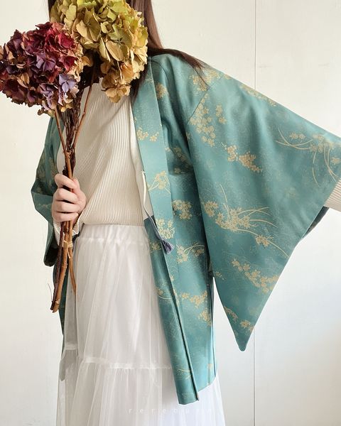 日本製和風印花薄款綠色古著羽織和服外套-H435