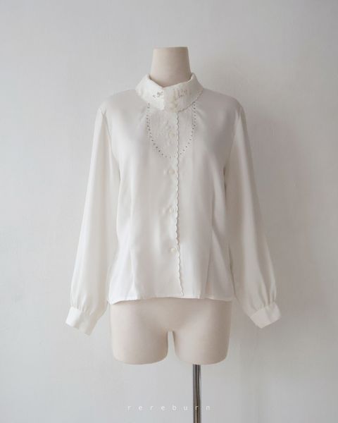 復古特殊剪裁刺繡領寬鬆歐美版型長袖白色古著襯衫-T114